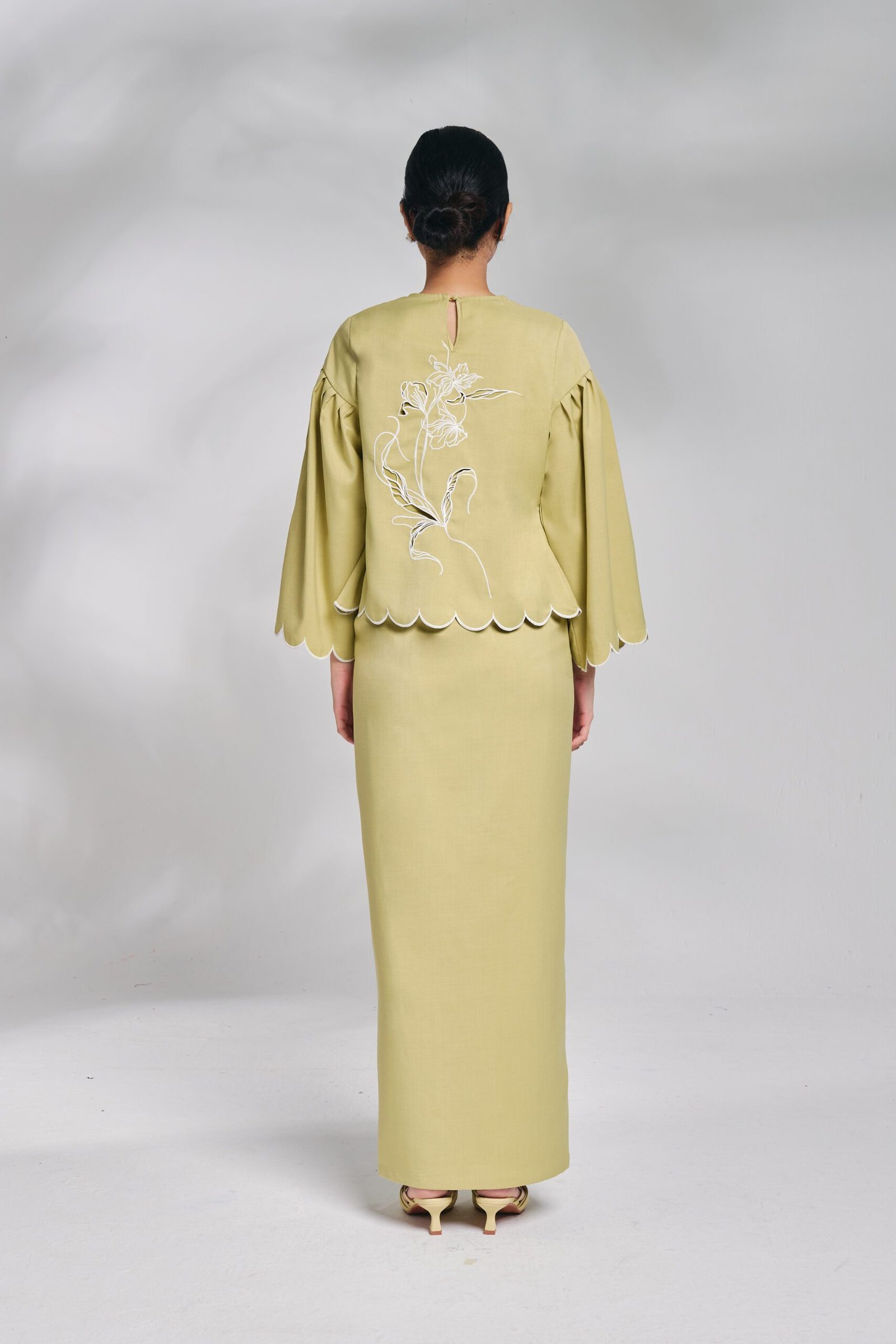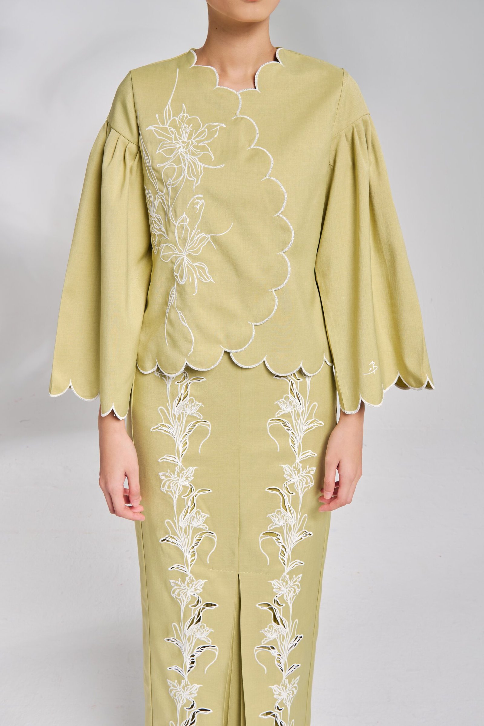 This design features sulam embroidery with cutwork finishing.